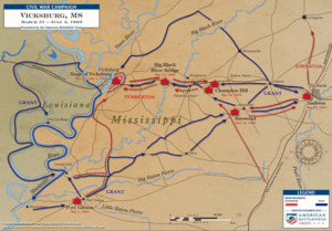 With his supply base reaching back to Memphis, Grant’s gambit began several miles upriver from Vicksburg where his army traveled west of the Mississippi River through the swamps and backchannels of Louisiana. It merged again with the Mississippi twenty-five airline miles south of Vicksburg in enemy territory. From there, the army of forty-five thousand moved northeast to the state capital of Jackson, pushing out Johnston’s army. It then moved west along the railroad to Vicksburg, where it lay siege to the city.[25]