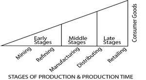 Figure 1 can be connected to Roger Garrison’s (2001, 47) rendition of the structure of capital by placing R&D as the earliest component of the capital structure instead of “mining,” as Garrison did in his Hayekian triangle in figure 2.[2] In a subsequently produced PowerPoint slide on capital-based macroeconomics, Garrison (2011) illustrated the earliest component as “product development” rather than mining. Had Garrison revisited his book’s discussion of Austrian business cycle theory (ABCT) with “product development” and creative destruction in mind rather than “mining,” he might have connected his independent analyses of innovation and ABCT.